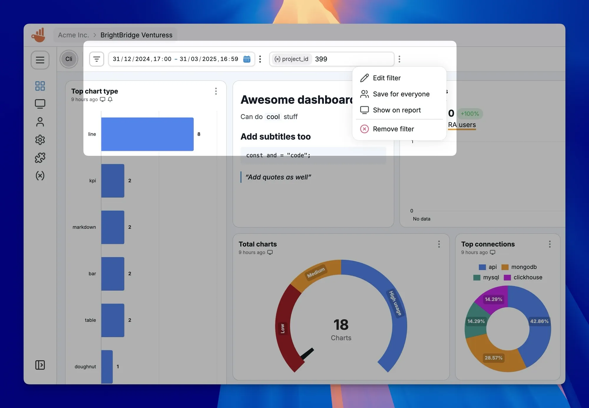 Filters have been completely rebuilt from scratch. You can now create and save custom dashboard filters, add multiple date ranges, and even use variables like start_date and end_date inside your queries. The filters can either live on your browser only, or you can save them for your entire team. Filters now sync with public reports too, so clients can interact with dashboards easily.