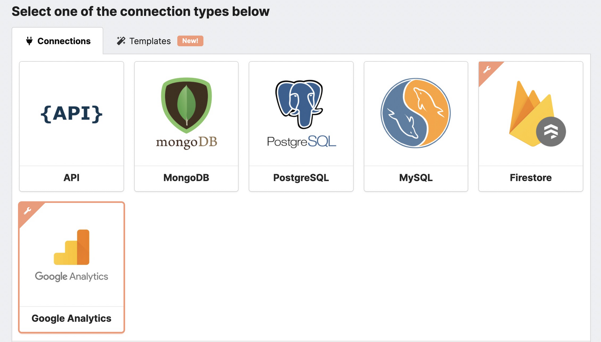 After creating a new project, you will be redirected to the Connections screen. Select the templates section and then click on the Google Analytics card from the list.