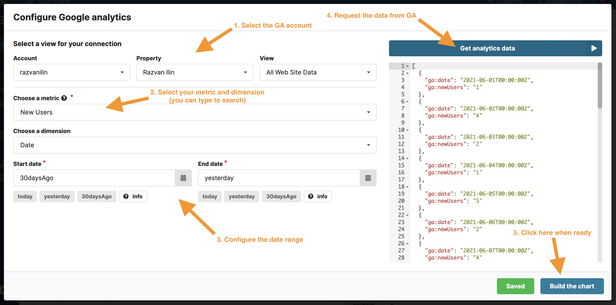 After clicking "Make request", Chartbrew will open the configuration window where we can select the Google Analytics account to fetch data. Afterward, we can request the metrics and dimensions on the given date range. Follow the instructions in the screenshot below to configure the request.