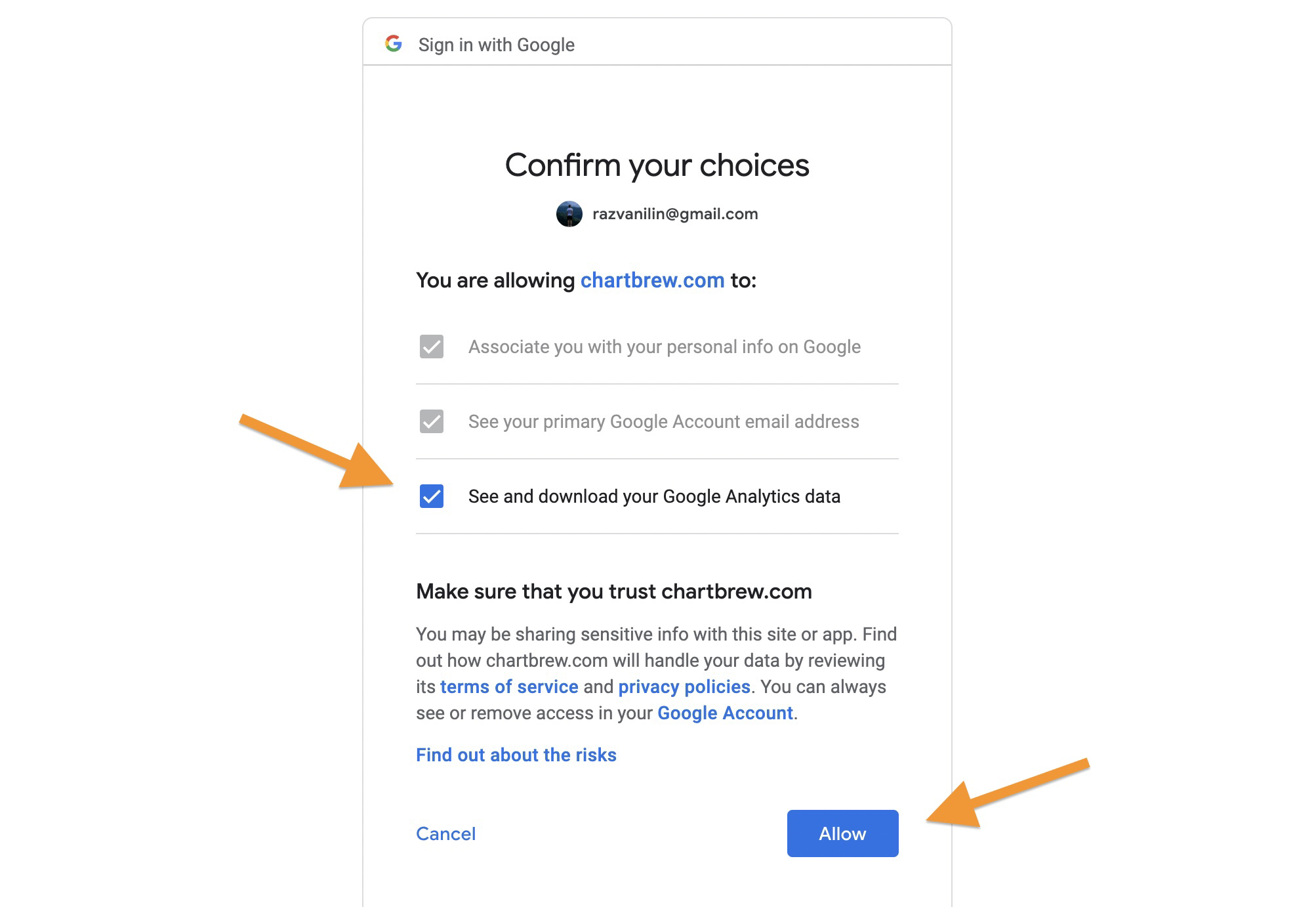 Click to allow Chartbrew to see the Google Analytics data
