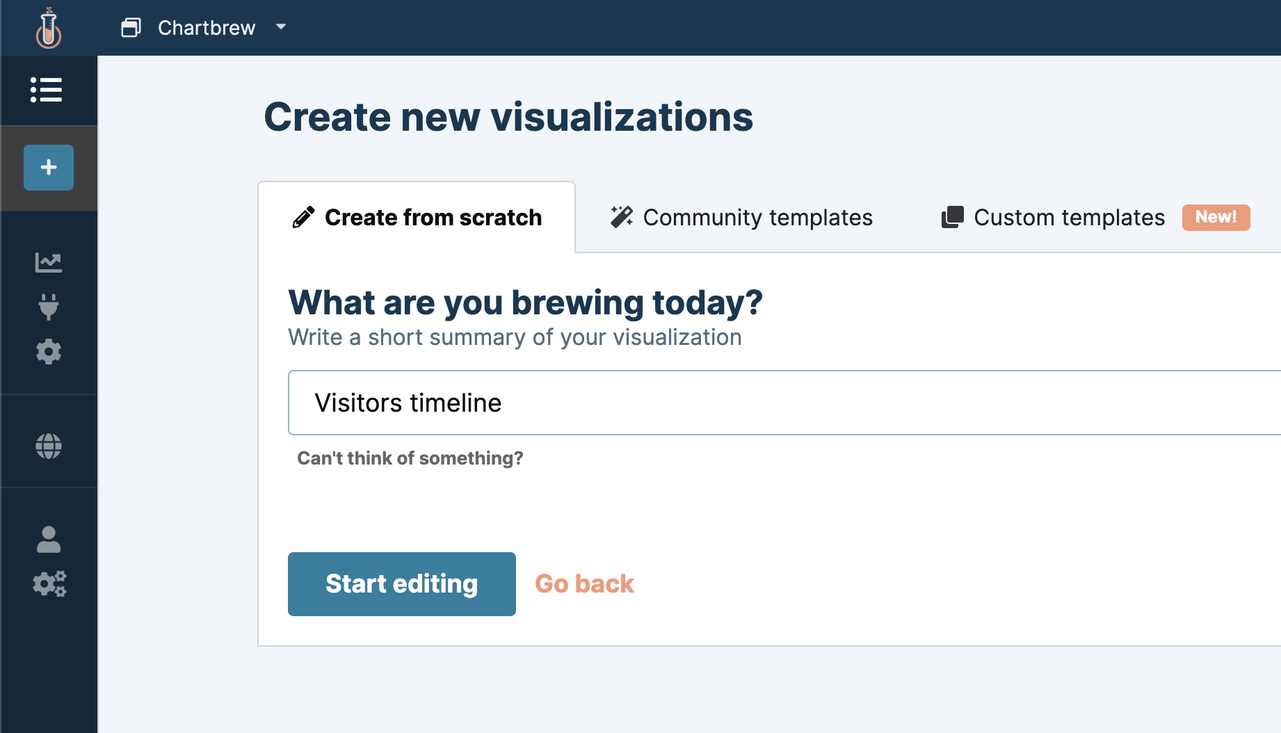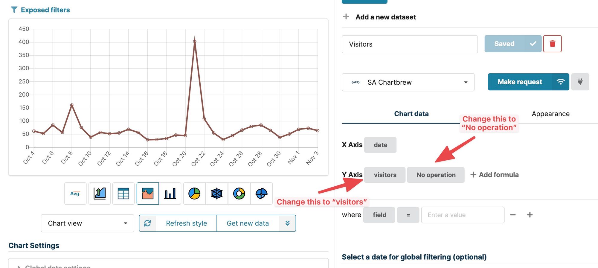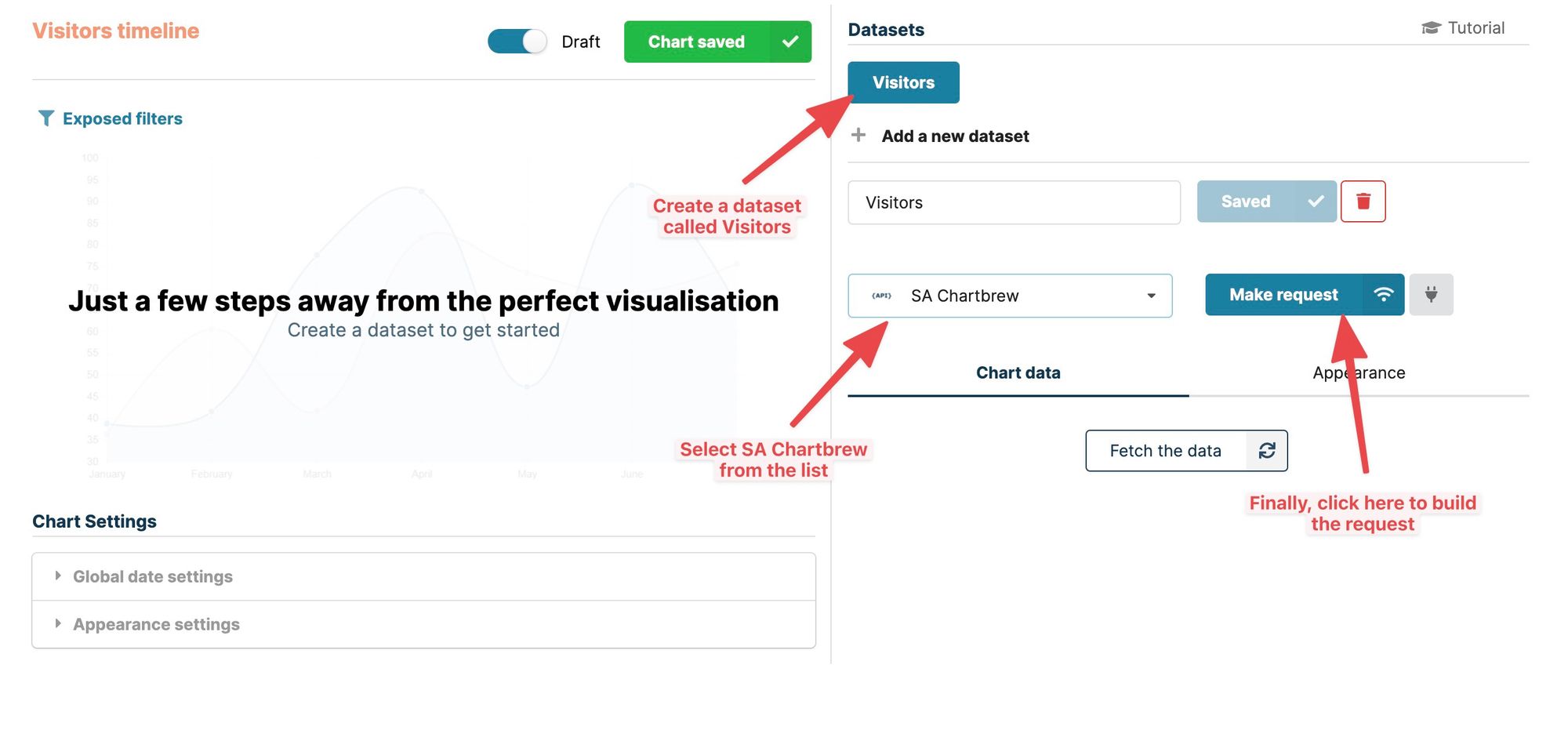 When you get to the editor page, create a new dataset and name it "Visitors". Then you can select the "SA Chartbrew" connection we just created. Next, we proceed to build the API call to fetch the data.