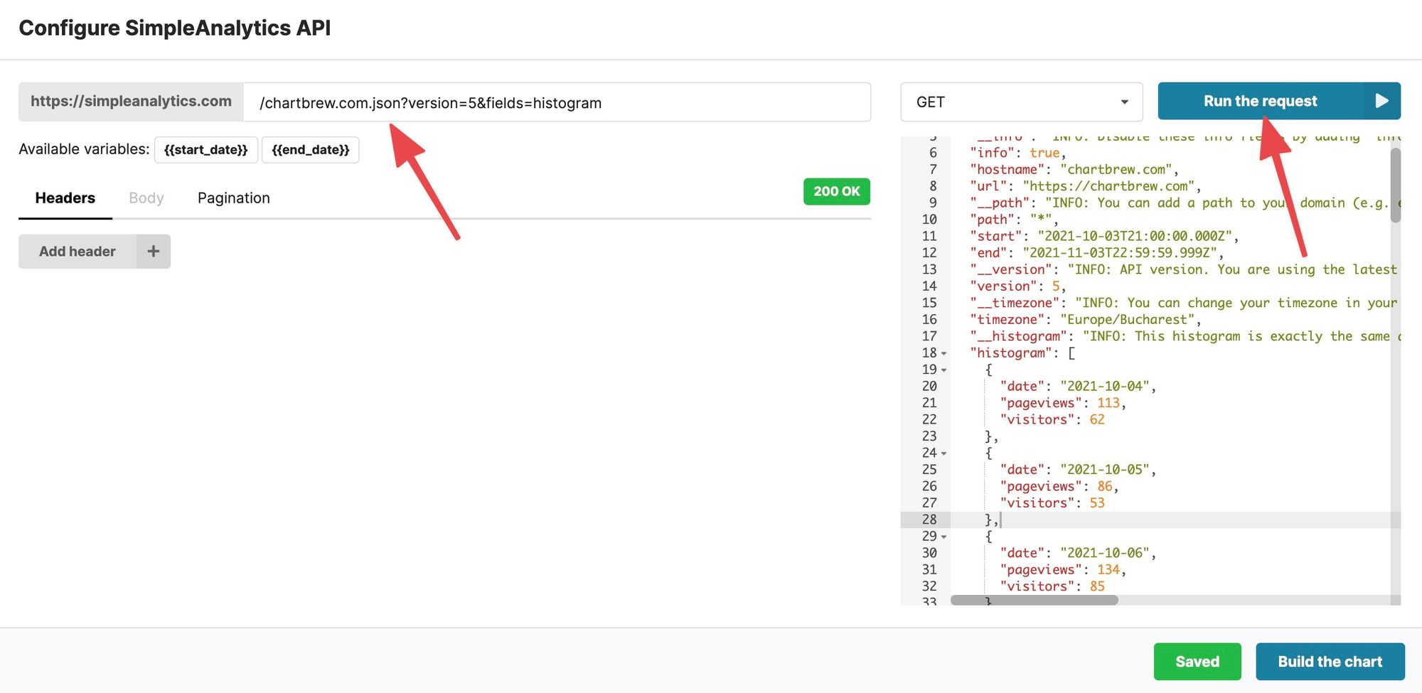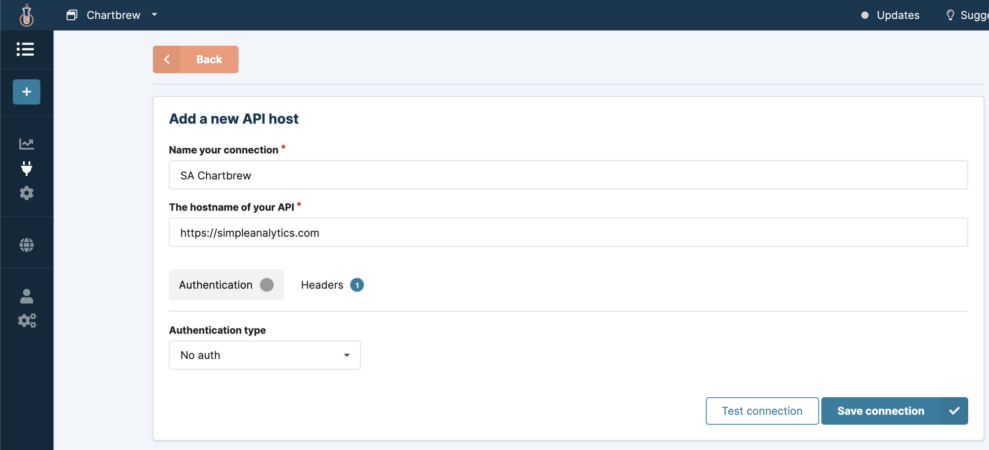 First, create a new API connection with https://simpleanalytics.com as the hostname.