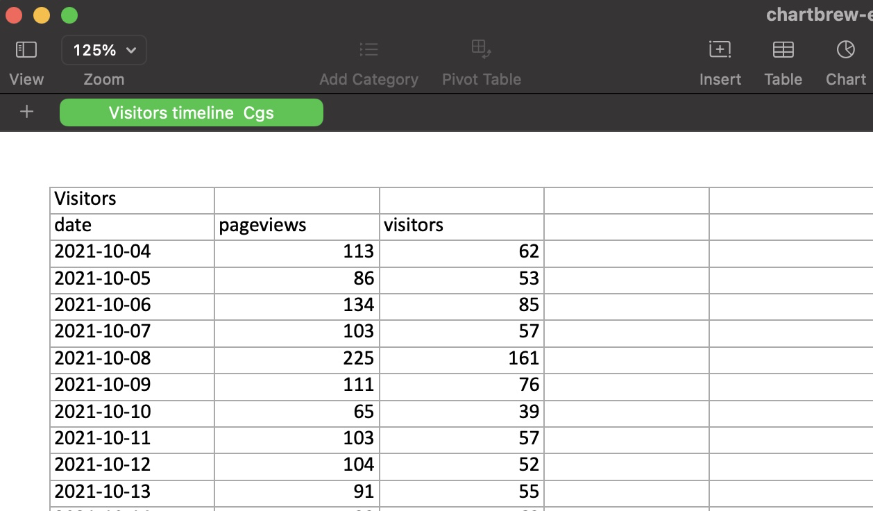The exported file will have all the chart data you selected in the modal. Take a look below at how the export looks like and how it's structured: