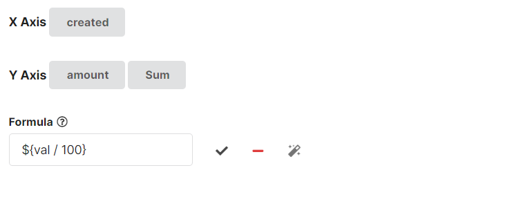 Stripe's amount data is represented in cents and we rarely need such a value. The value in the screenshot above is in cents as well, so let's format that to show full dollars (or any other currency you have in your Stripe account). Click on the Add a formula link next to the Y-Axis configuration like so: