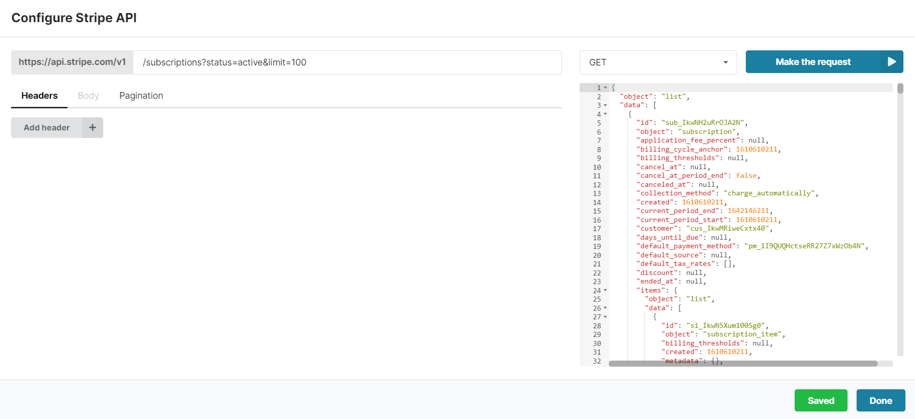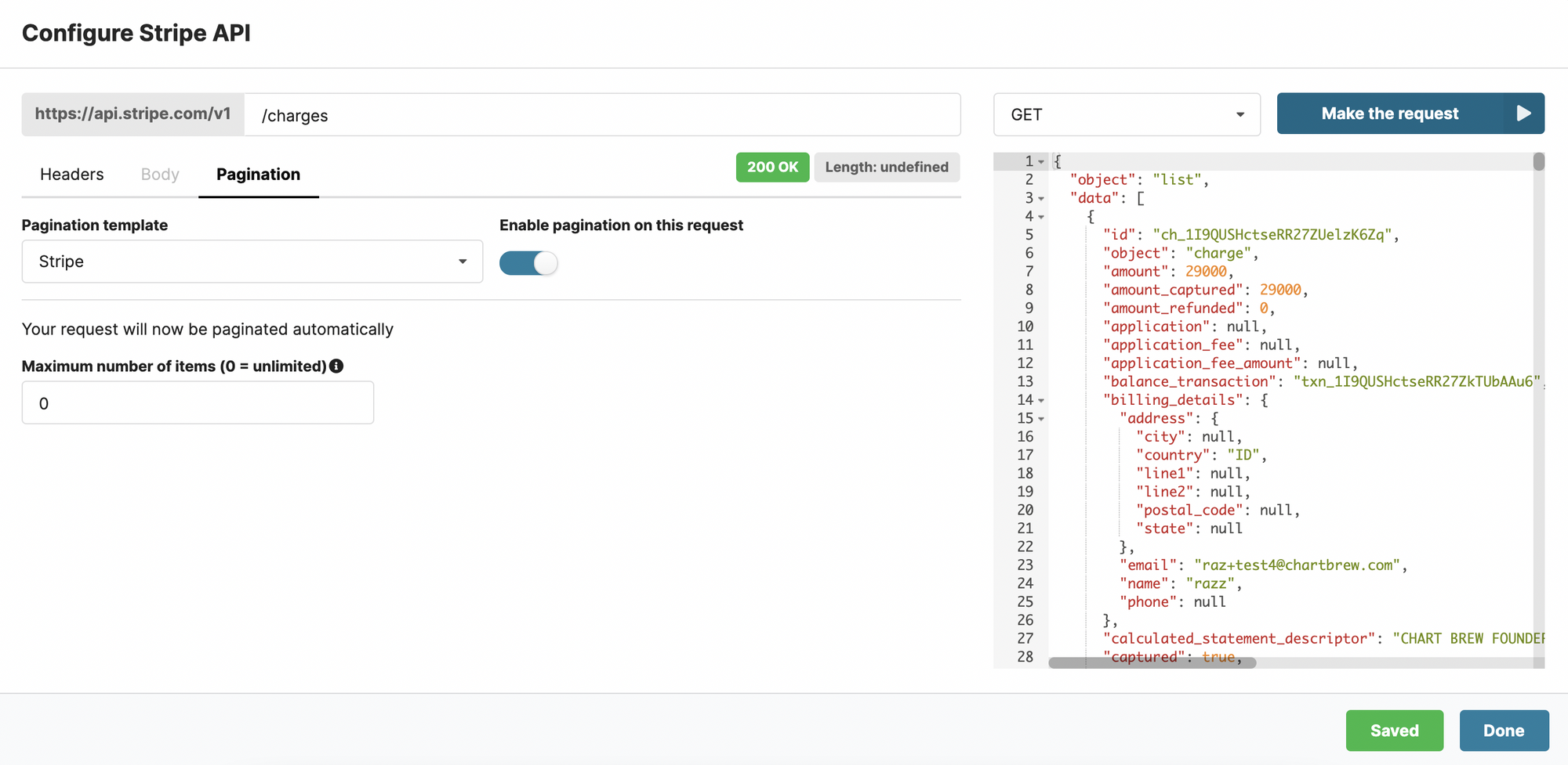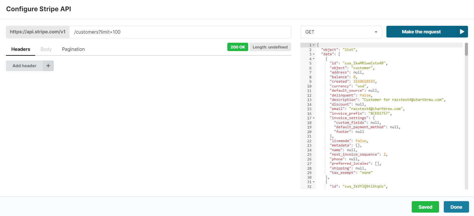 Note that we selected the Stripe API connection from the dropdown. Let's click on Make a request to get our data from Stripe.
