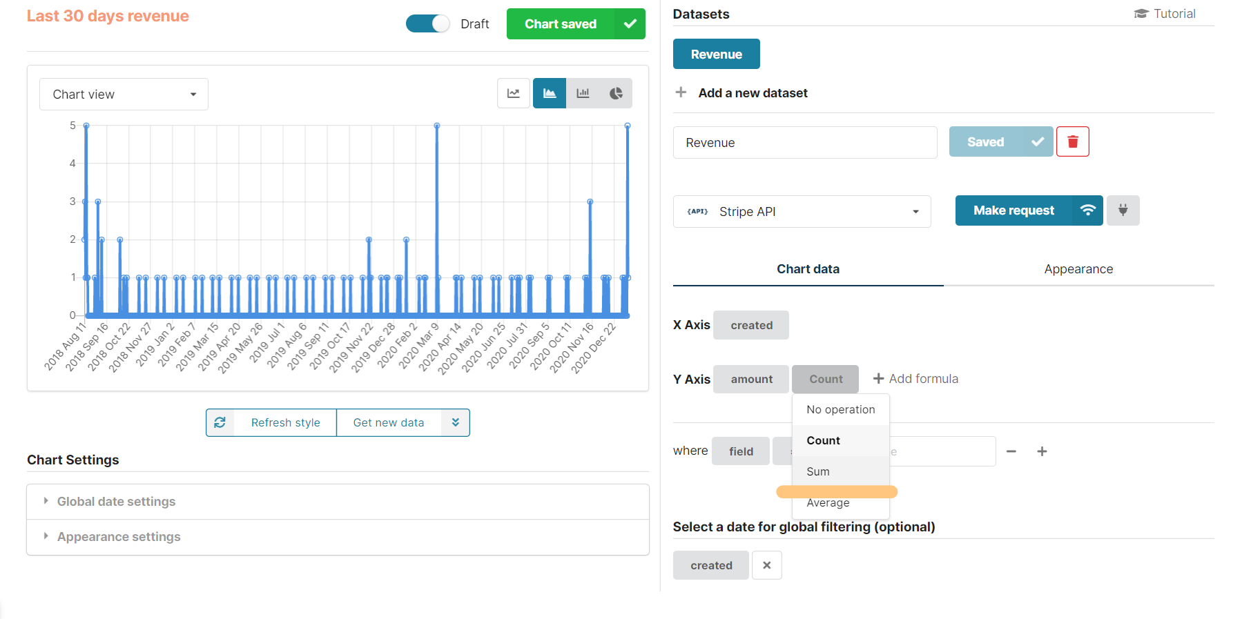 The first thing we need to do is to make sure we have the amount field selected on the Y-Axis with the Sum operation on it. The operation will add all the charge amount together in case multiple charges happened during a day (and hopefully that's the case!).