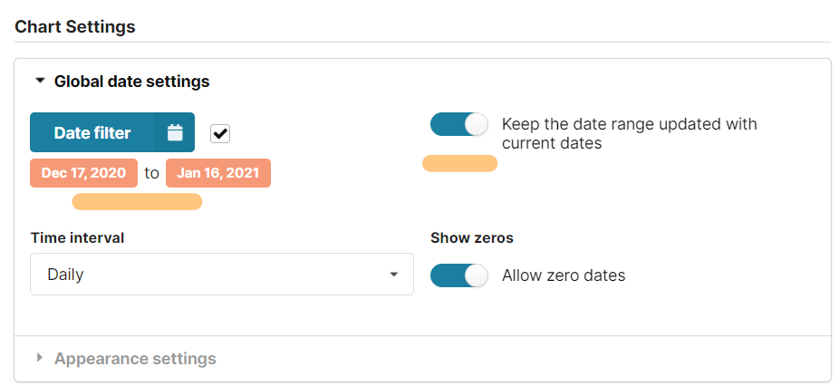 Next, we want to make sure we get only the charges that happened in the last 30 days. To do this, expand the Global date settings menu on the left and use the calendar tool to select the last 30 days. Additionally, turn on the toggle on the right to keep updating the date range with the latest day.