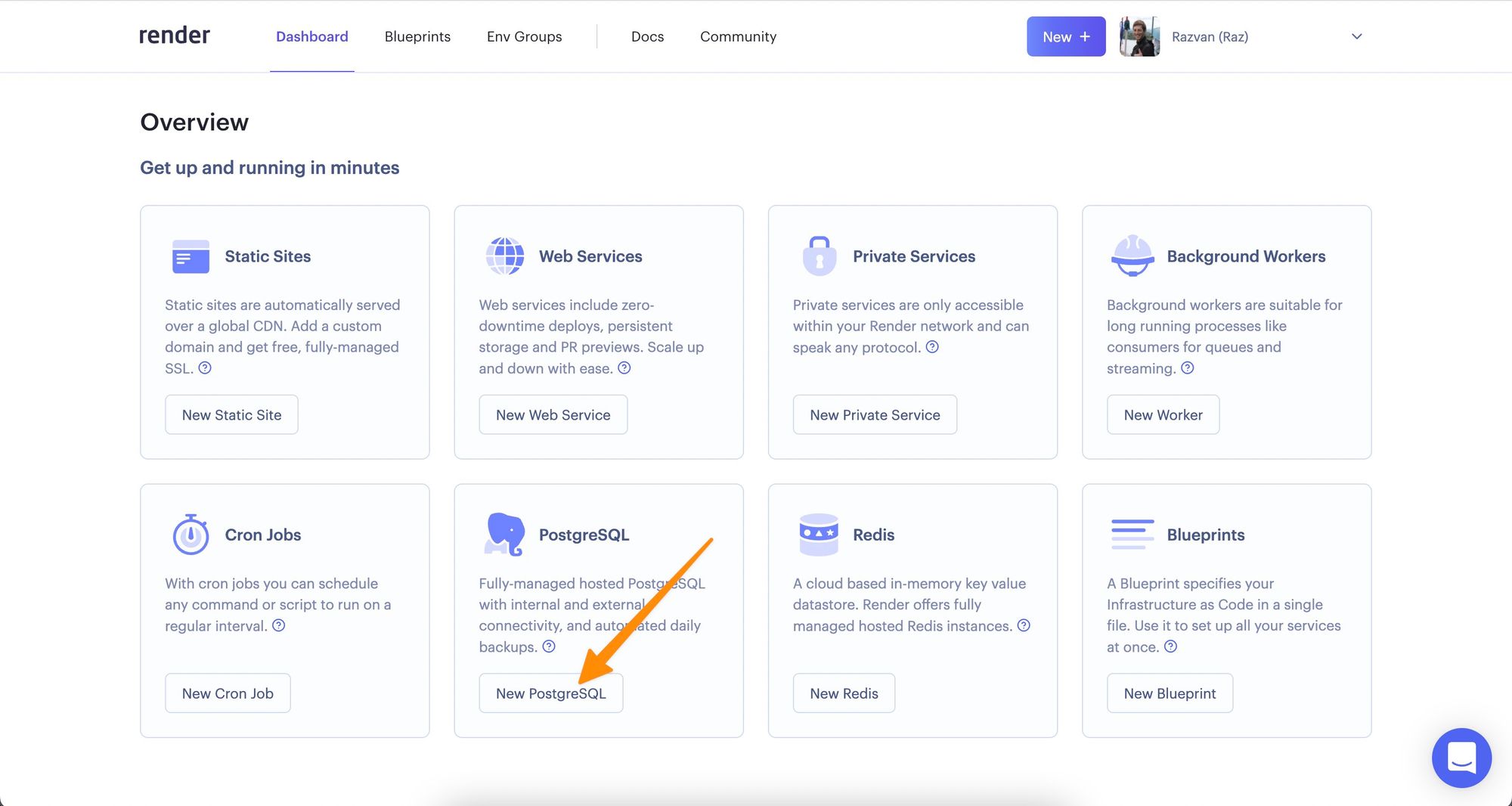 Back on your Render dashboard, click the New button at the top, and select Web Service from the dropdown list.