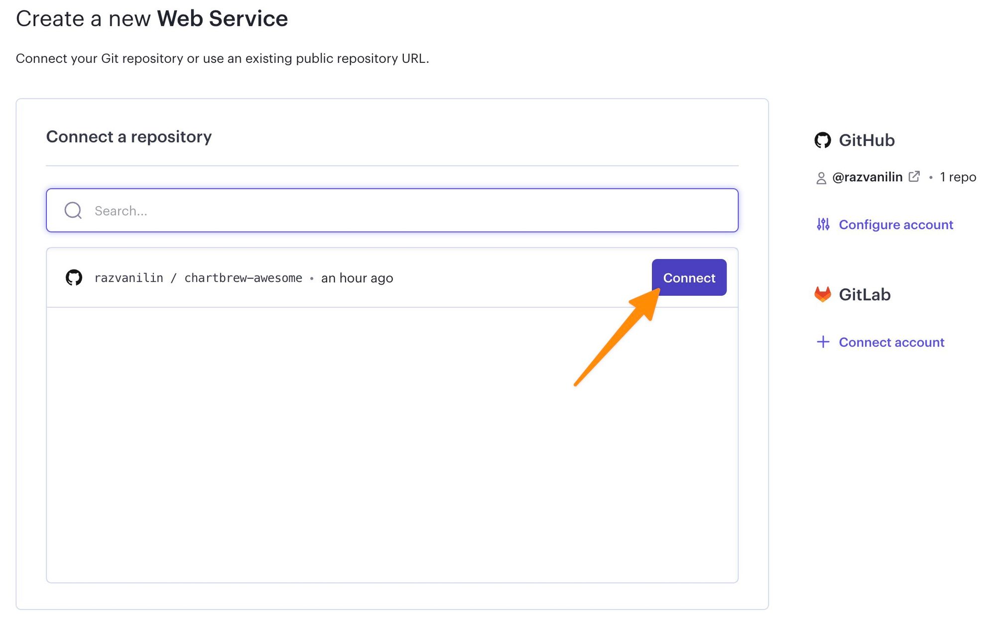 If you cannot see the newly forked project in the list, click to connect your GitHub or GitLab account or update your integration to allow access to your Chartbrew fork.
