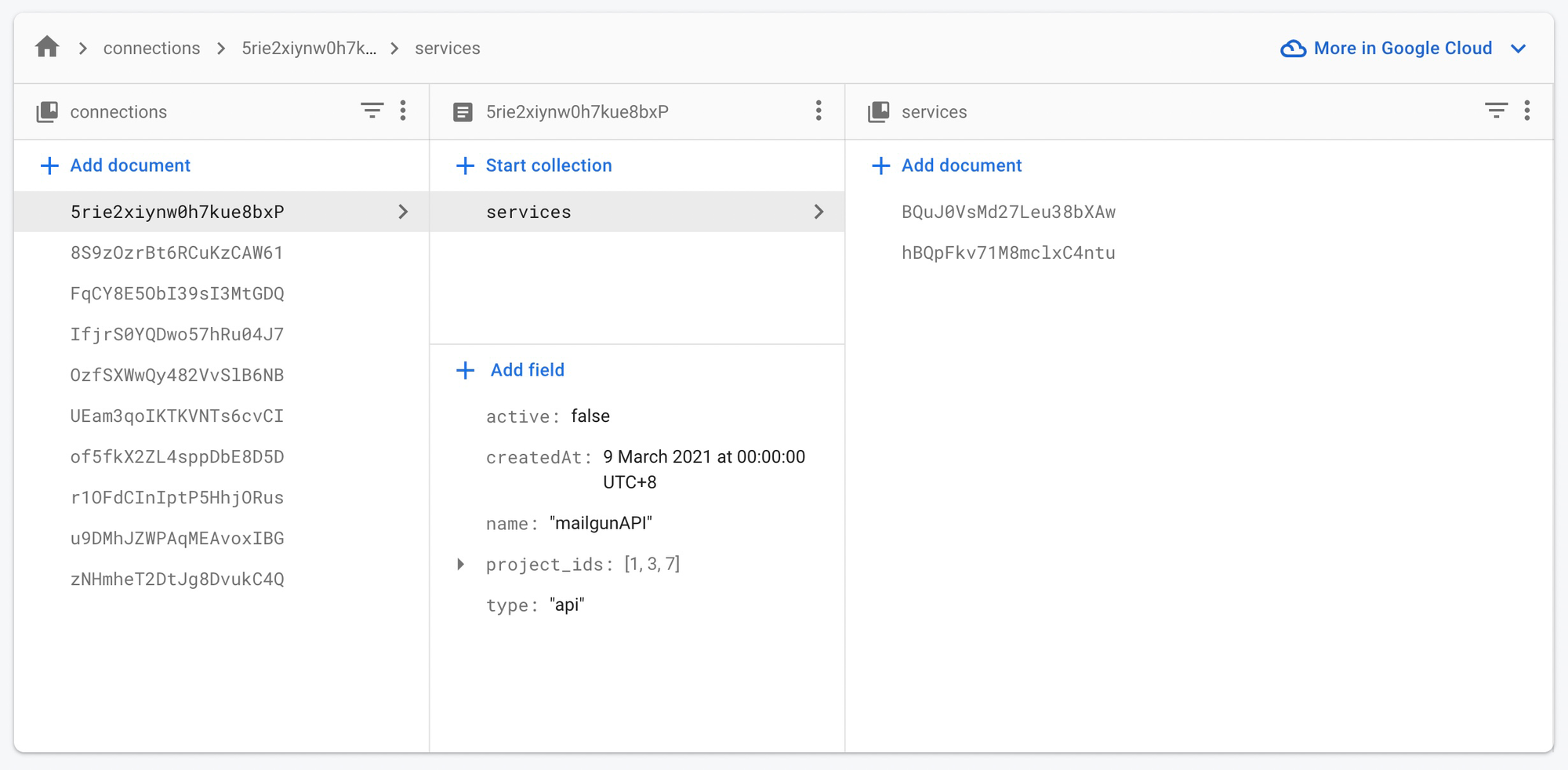 Connections collection with services sub-collections