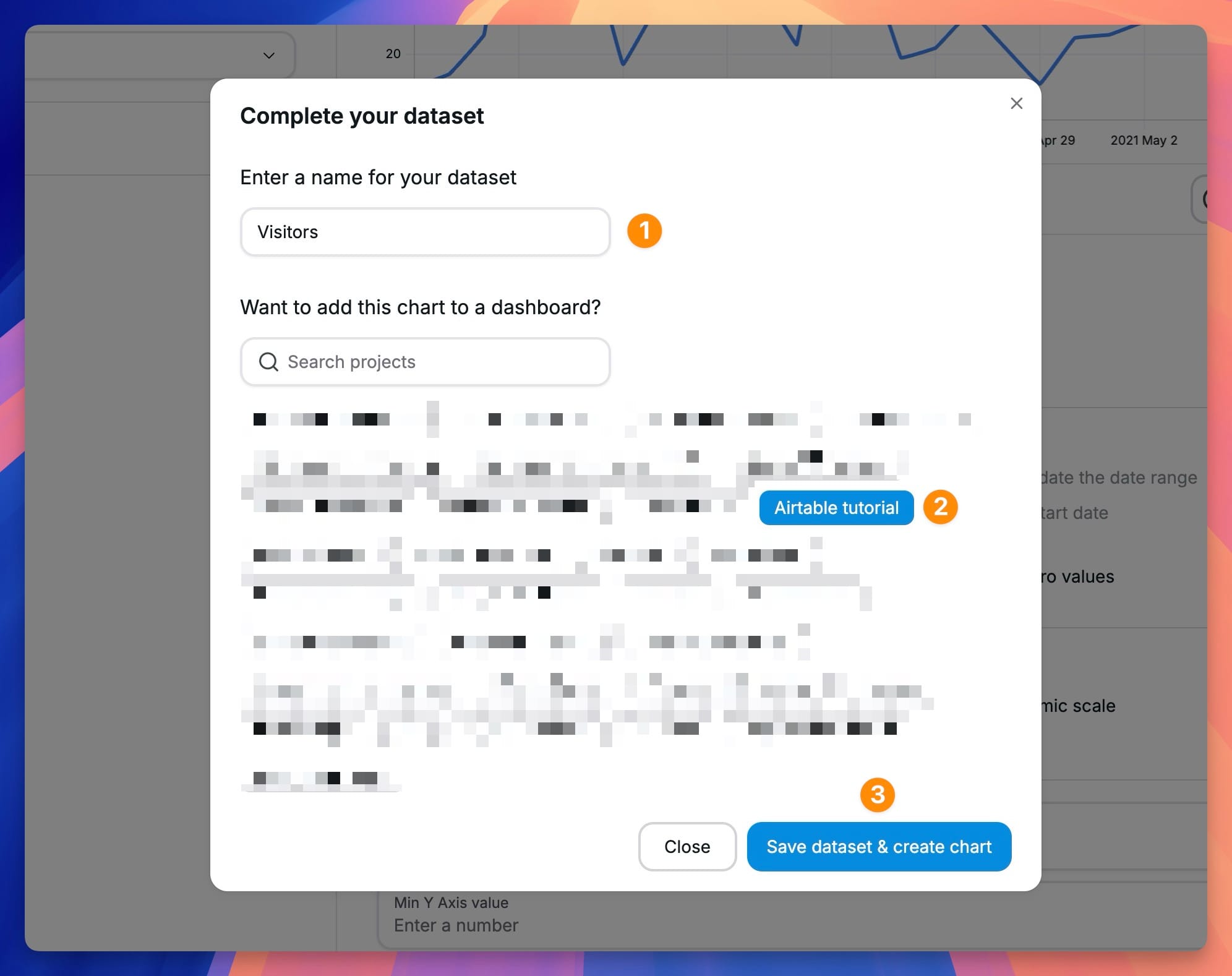 The chart is going to appear in the project you selected. If you don't select any project, your dataset will be added to your list, and you can always come back and use the dataset in your charts.