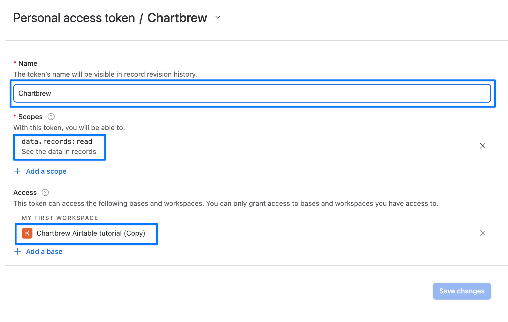 Before we create the connection in Chartbrew, we have to generate a new Airtable Personal Token to authenticate the data requests from Chartbrew. You can generate yours from the account page here.
