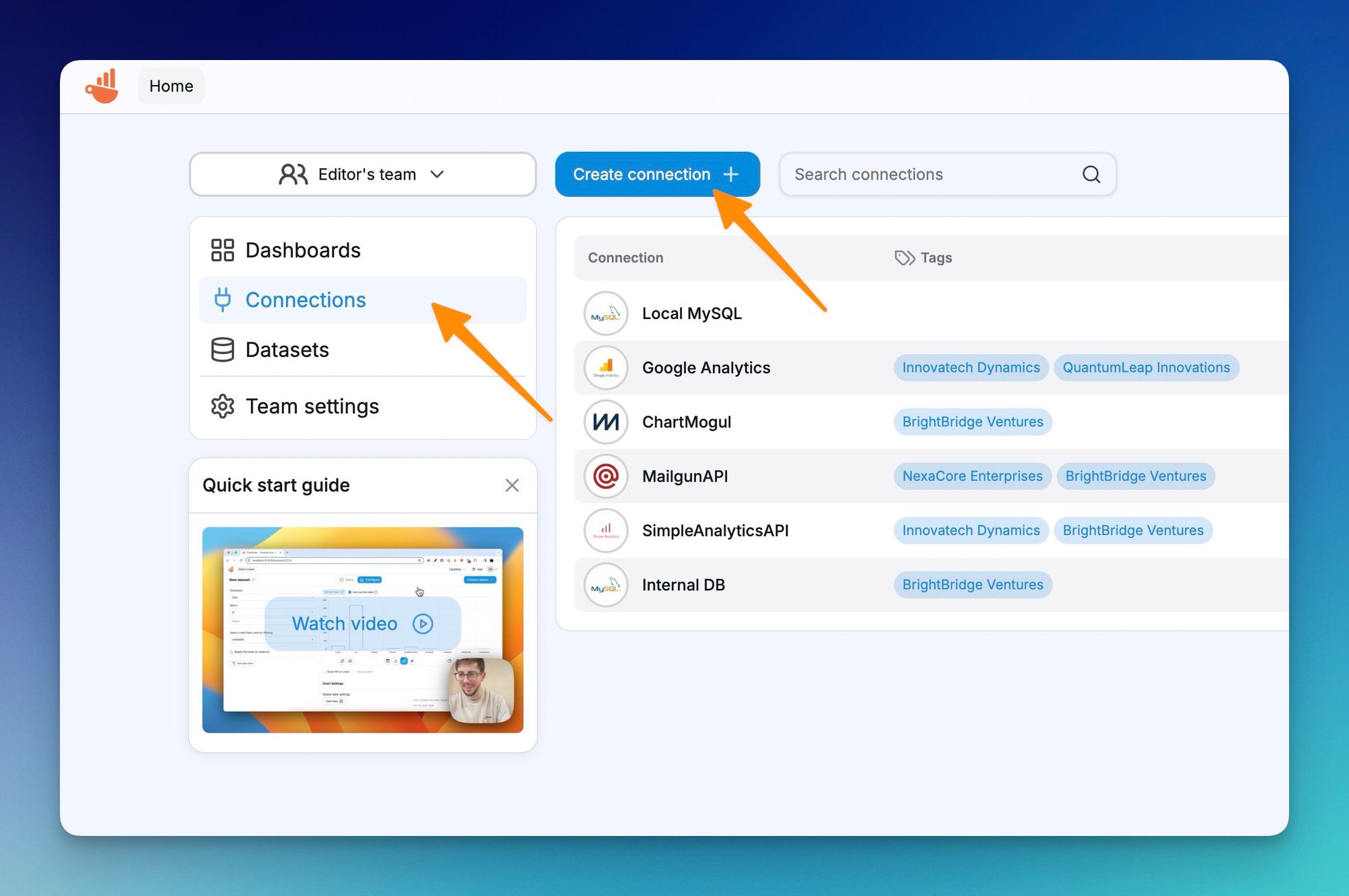 The real value of Chartbrew is when you connect more data sources to the platform. Check the full list of tutorials to see what else you can connect. Then learn how to create client reports and share them with others, and once you're ready to scale, create dashboard templates and create multiple dashboards for your clients.