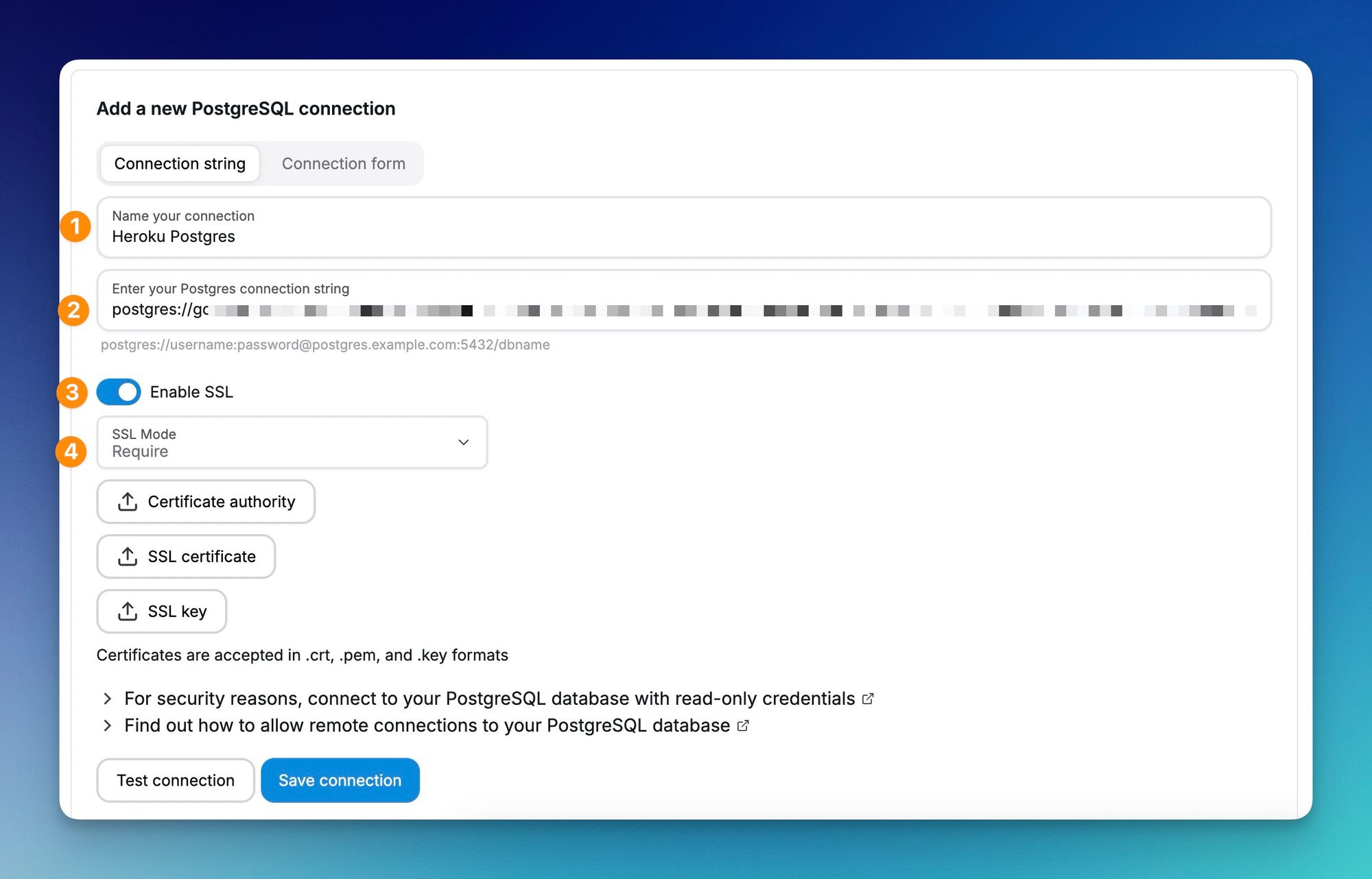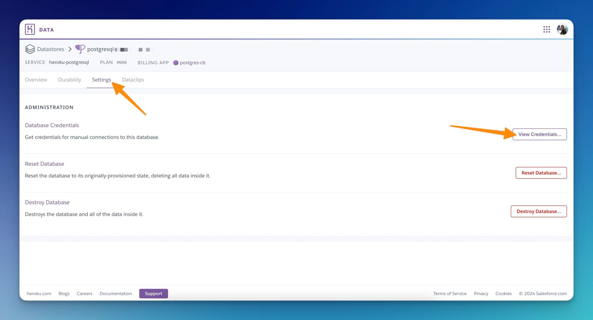 If you just want to test the integration with a sample database, you can get the main credentials from the Heroku Postgres settings page, but please be aware that these credentials have Write Access to your data. Click on the Postgres add-on from your Heroku dashboard and head over to the credentials page.