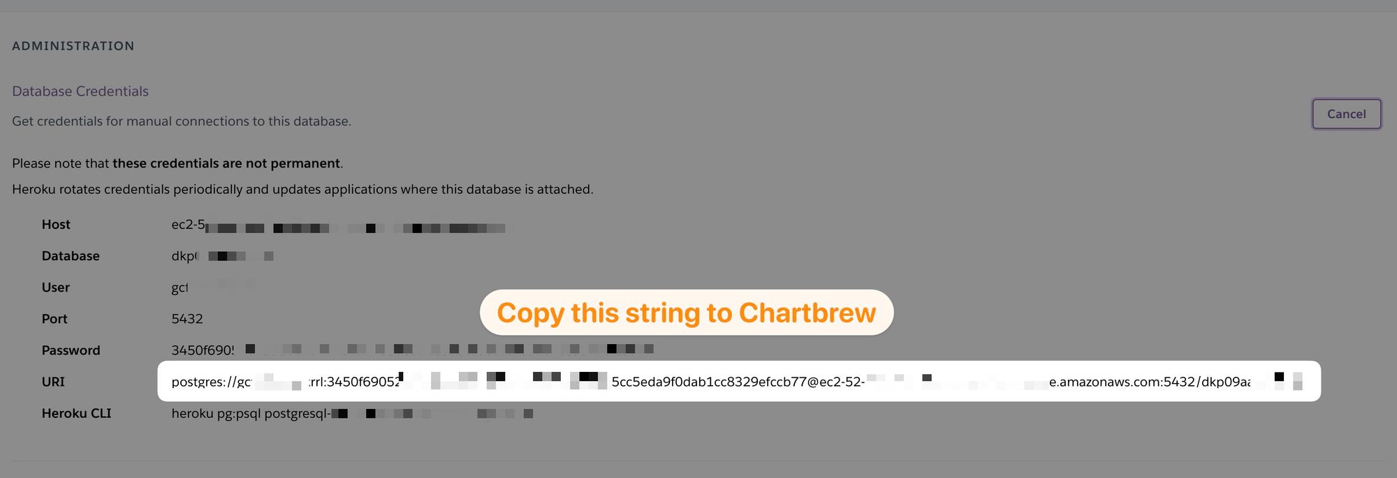 Next up, we will need to get the Postgres database credentials from Heroku. If you use a production database, it is recommended to connect with a read-only user. You can find out more about how to manage credentials on Heroku in the link below: