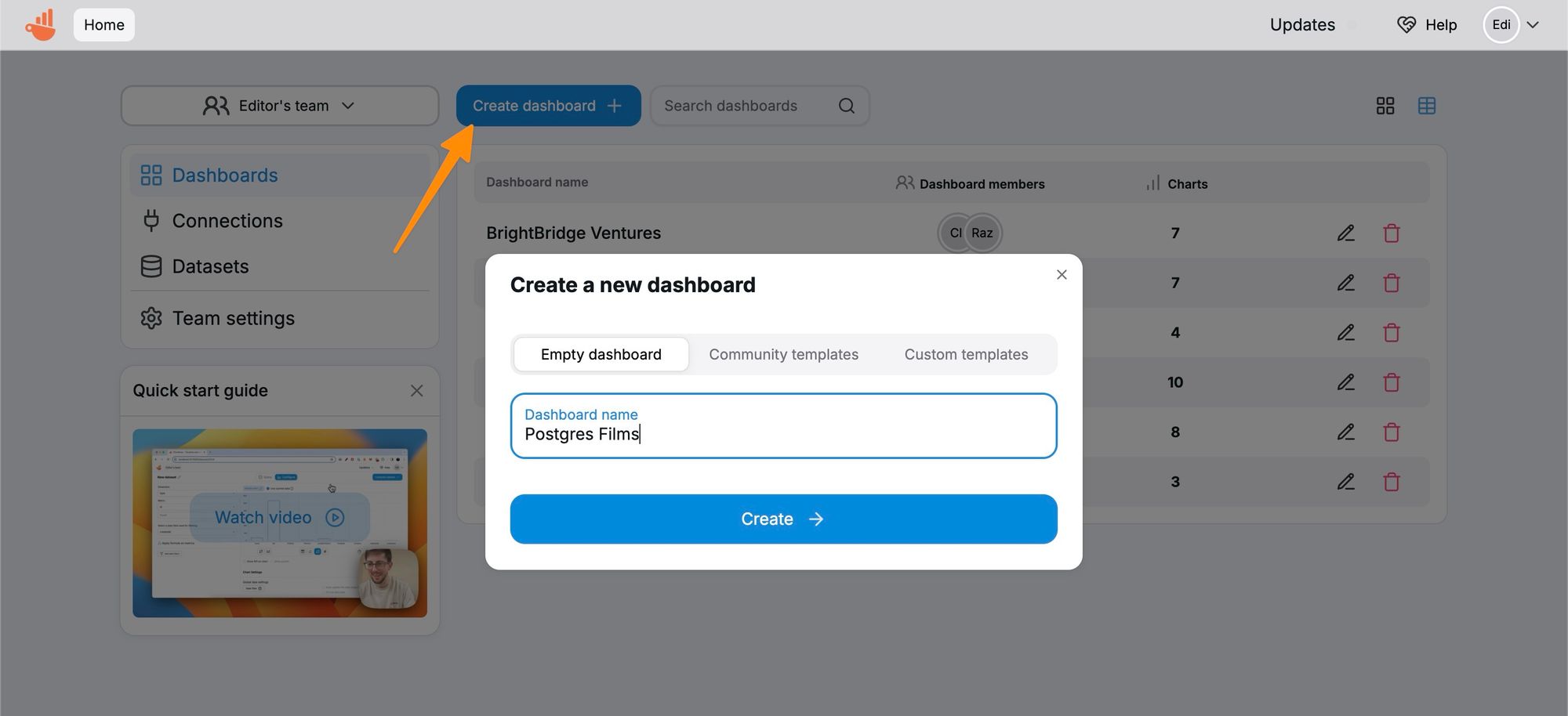 Once the dataset is saved, you will be redirected to the main dashboard. Let's create a new dashboard to create our first charts.