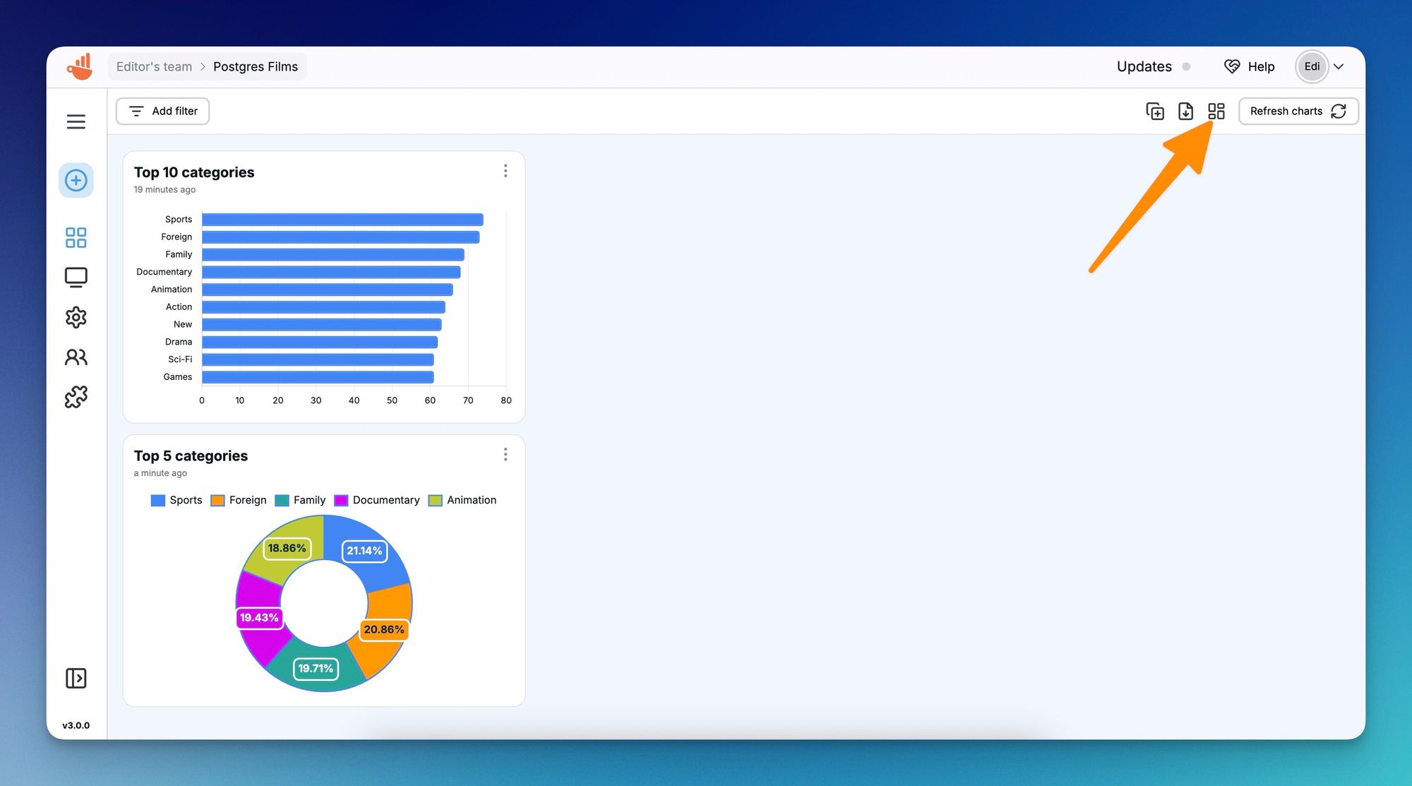 Once you create more charts, you might want to re-arrange the widgets. You can click on the layout button on the right to create and edit the layout. We can then create more datasets and add more charts to the dashboard to make sure we have a good view of what's going on with the data.