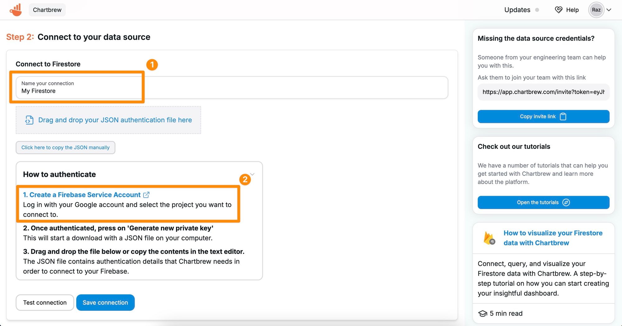 To connect to Firestore, we will need a JSON authentication file which we can download from the Firebase project settings. First, head over to the connections page in Chartbrew and create a new Firestore connection.