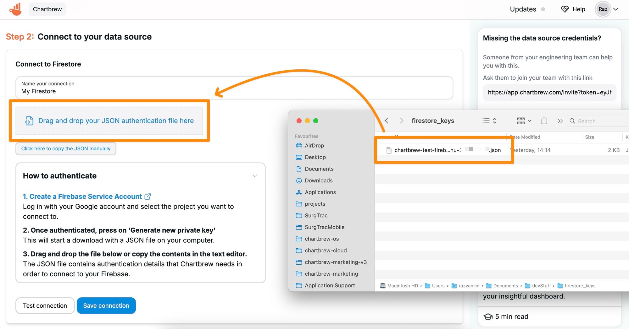 Once you have the key in a JSON file, it's time to return to Chartbrew and add the credentials to the form. You can either copy and paste the contents of the file into the form, or much easier, drag and drop the file directly on the form.
