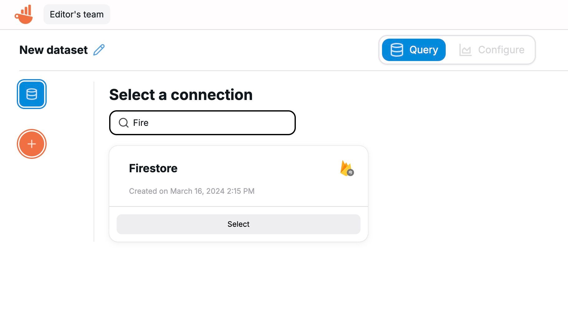 After creating the connection, you will be prompted to create a new dataset. Select the option and let's build our first dataset. You can also create new datasets from your the homepage. First thing when creating a new dataset, you will have to select its main connection. Select the newly created connection.