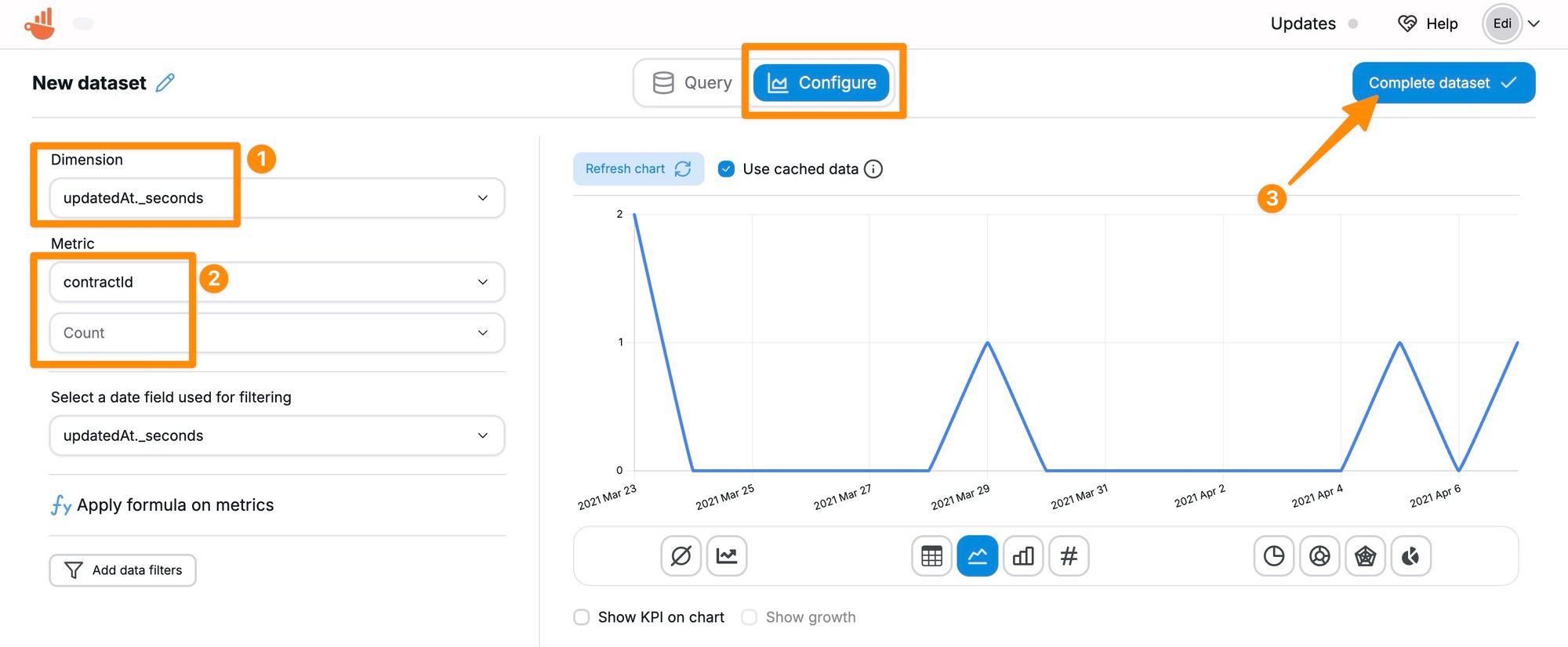 When you are happy with the dataset, click on the Complete dataset button to make it ready for charts. In the final step, you can set a name for your dataset so you can identify it later. You can also quickly add the chart you created inside the preview to your existing dashboards, but this step is optional.