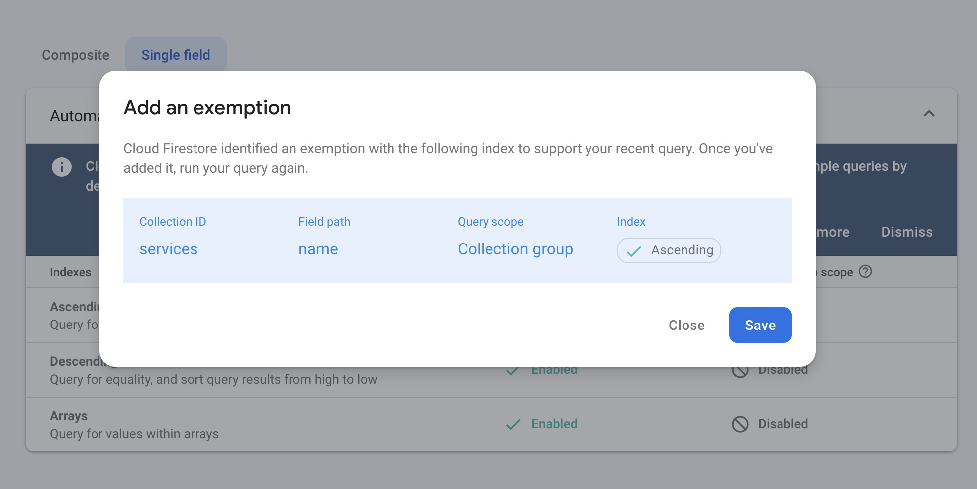 The link is generated by Chartbrew to take you to exactly where you need to add the index in your Firestore dashboard. Add the index by clicking on "Save" as shown in the picture below.