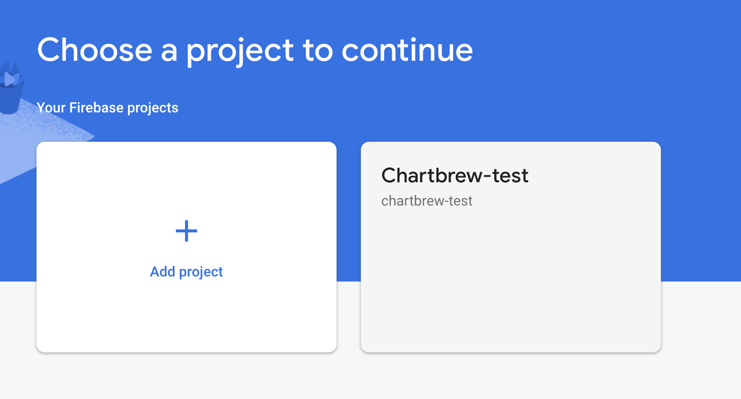 Enter any name for your connection and then click on the link to head over to your Firebase project settings. You can also click here to go there. Once you head over to the URL, you have to select the Firebase project you want to connect to. In the example below, the project is called chartbrew-test.