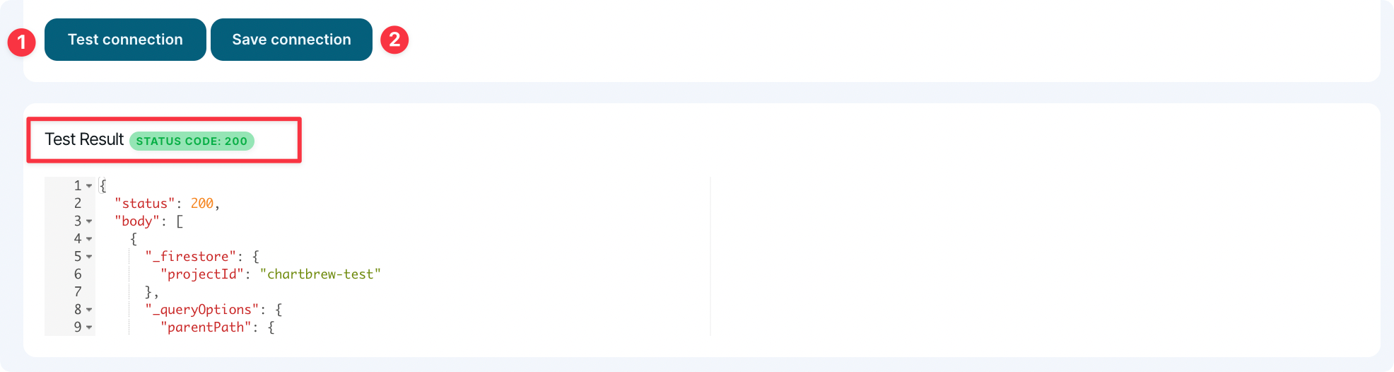 To make sure the authentication works, press the "Test connection" button, and you should get some info about your Firestore database below.