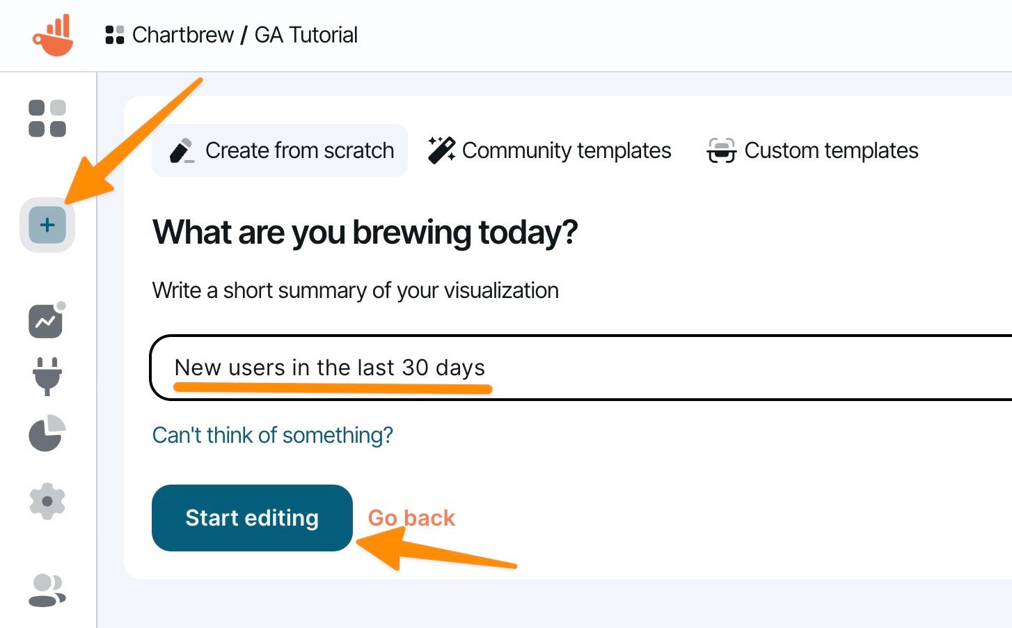 Let's start by creating a new chart in your dashboard. In this example, we will create a time series chart showing the new users in the last 30 days.