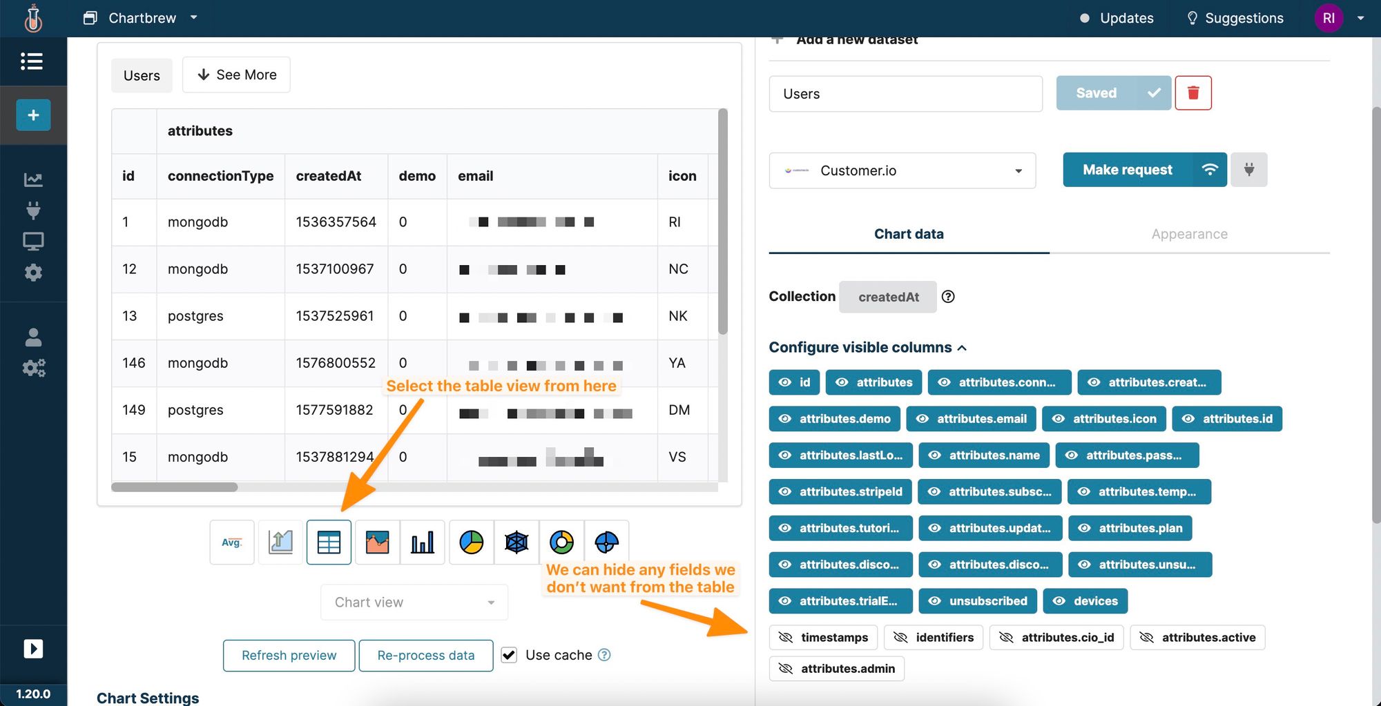 In this tutorial, we covered how to connect to Customer.io to get data, then how to create different visualization types using the Chartbrew chart editor. To get more value and learn how other bits of Chartbrew work, try the following next steps: