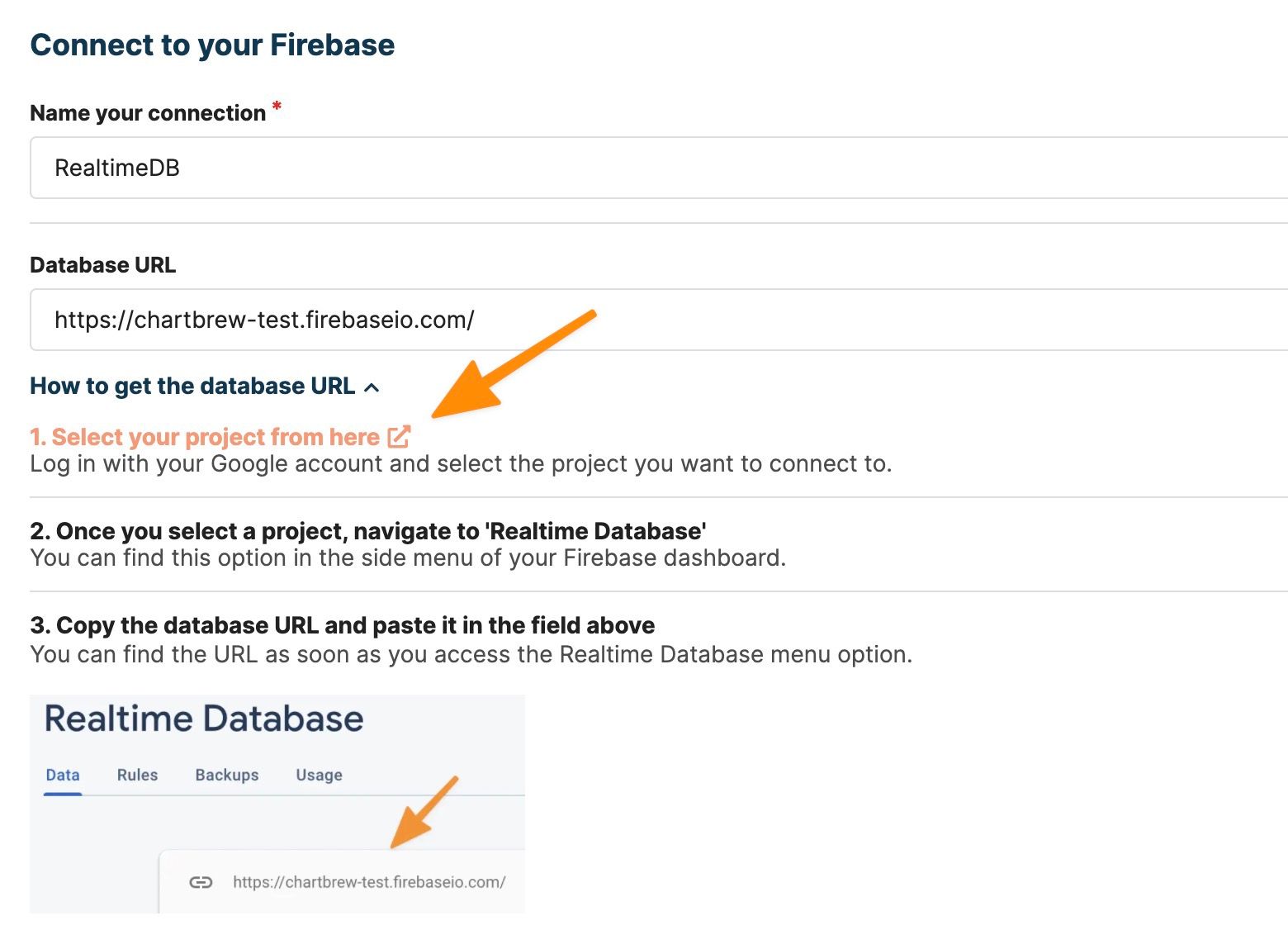 You will be redirected to the "Connections" page where you have the option to create a connection to your Realtime Database. Select the option from the list to get to the connection form.