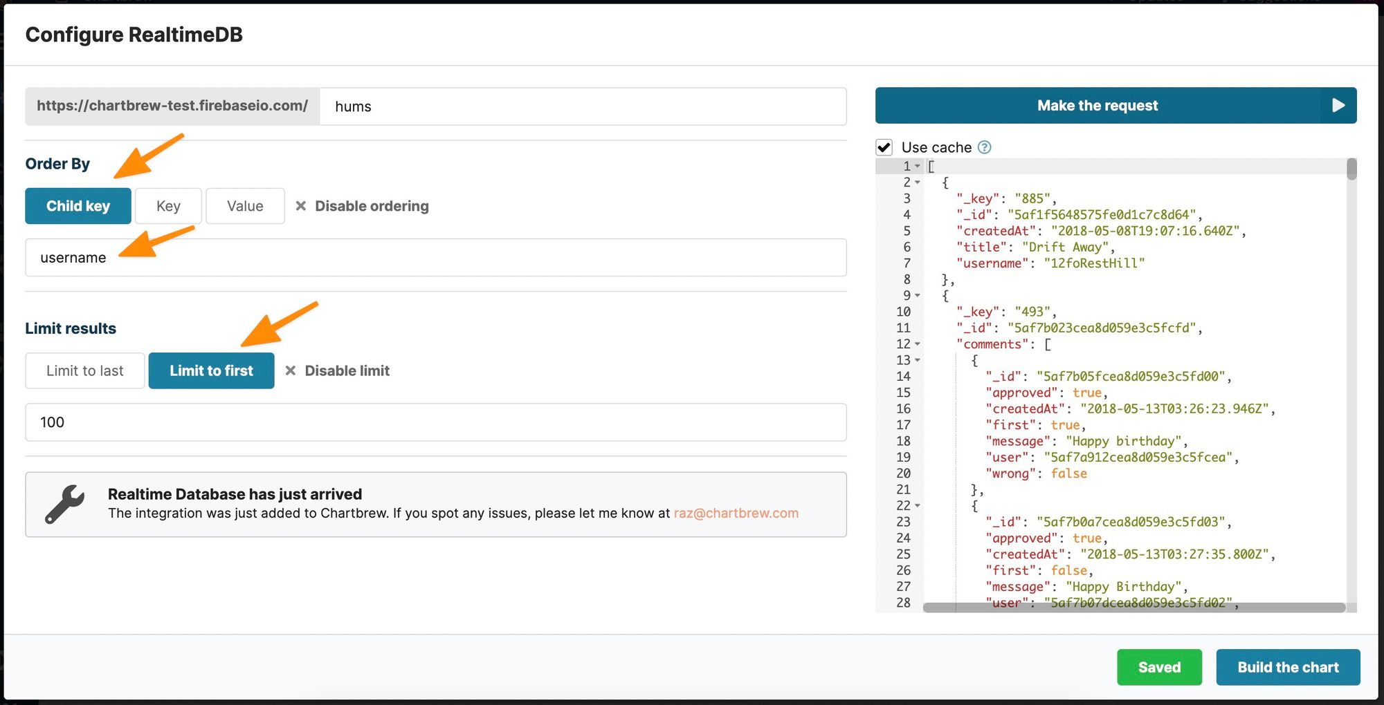Once a connection is selected, you can "Make a request" for data. Click on the button to see the request options. You can choose the path, order, and limit the data you get from the Realtime Database.